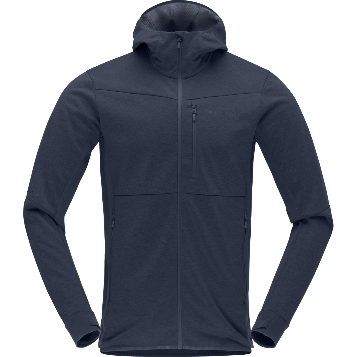 Main features include a beanie-compatible hood, elastic piping around the face, a chest pocket, two hand pockets, and cuffs with thumbholes. The jacket has a technical fit with a Y-cut and articulated arms for good movement while climbing. A longer cut in the back ensures extra protection. No seams on the shoulders to prevent chafing when wearing a backpack.Â