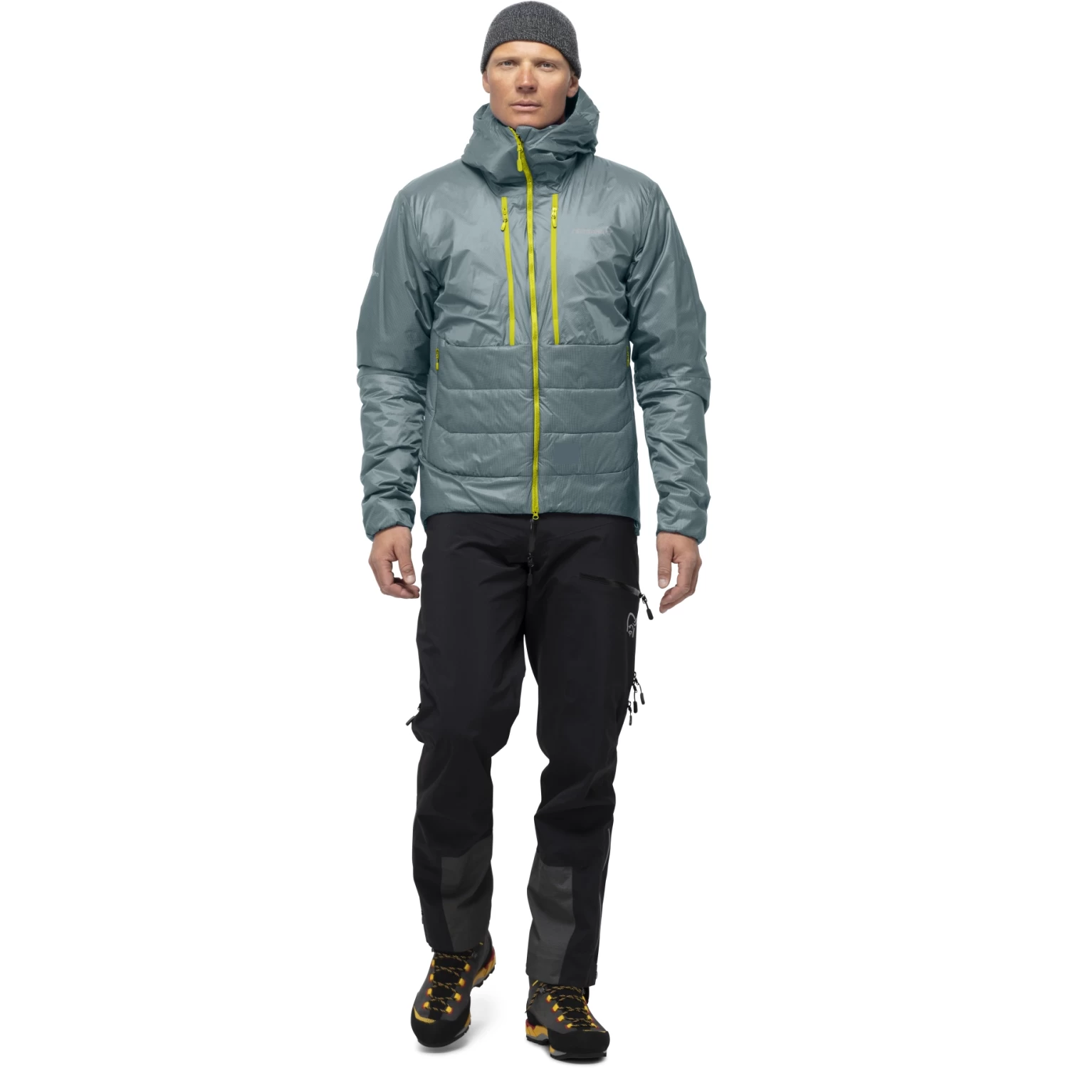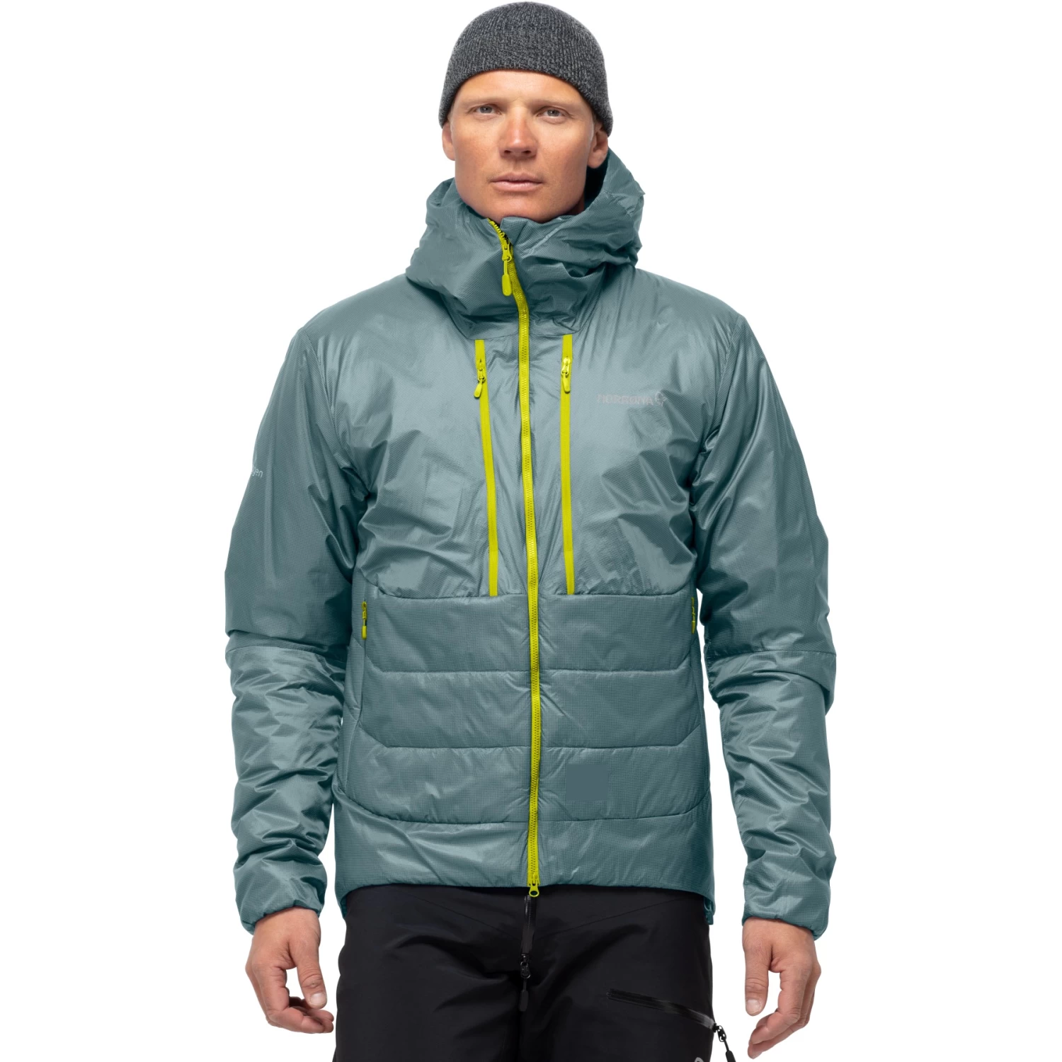 The insulation is a recycled PrimaLoft® Gold Insulation Cross Core™ with aerogel fibers which offers an outstanding warmth-to-weight ratio. Aerogel is known as the world’s lightest solid, this quality utilizes its great insulation properties into outdoor gear. To ensure maximum performance, Norrøna is using 100 g/m2 of insulation in the body and 80 g/m2 in sleeves and hood.
